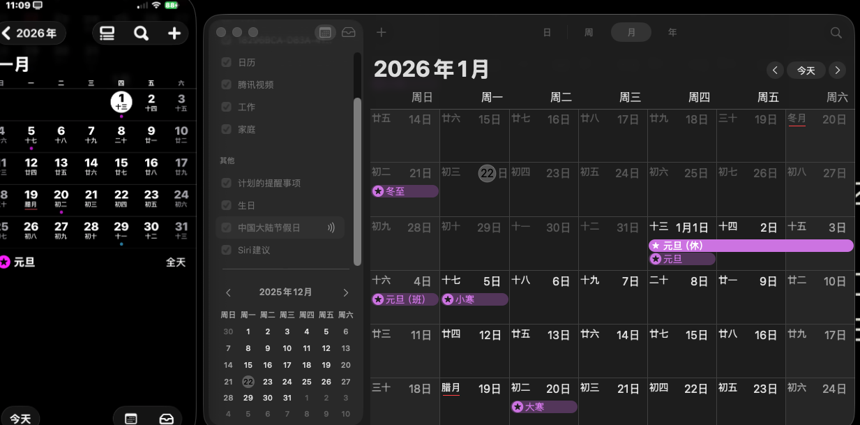 更新完IOS26系统之后,iPhone的日历中没有显示中国节假日,Mac上就有。添加订阅日历也不好使,所有网上能查到的都用不了。