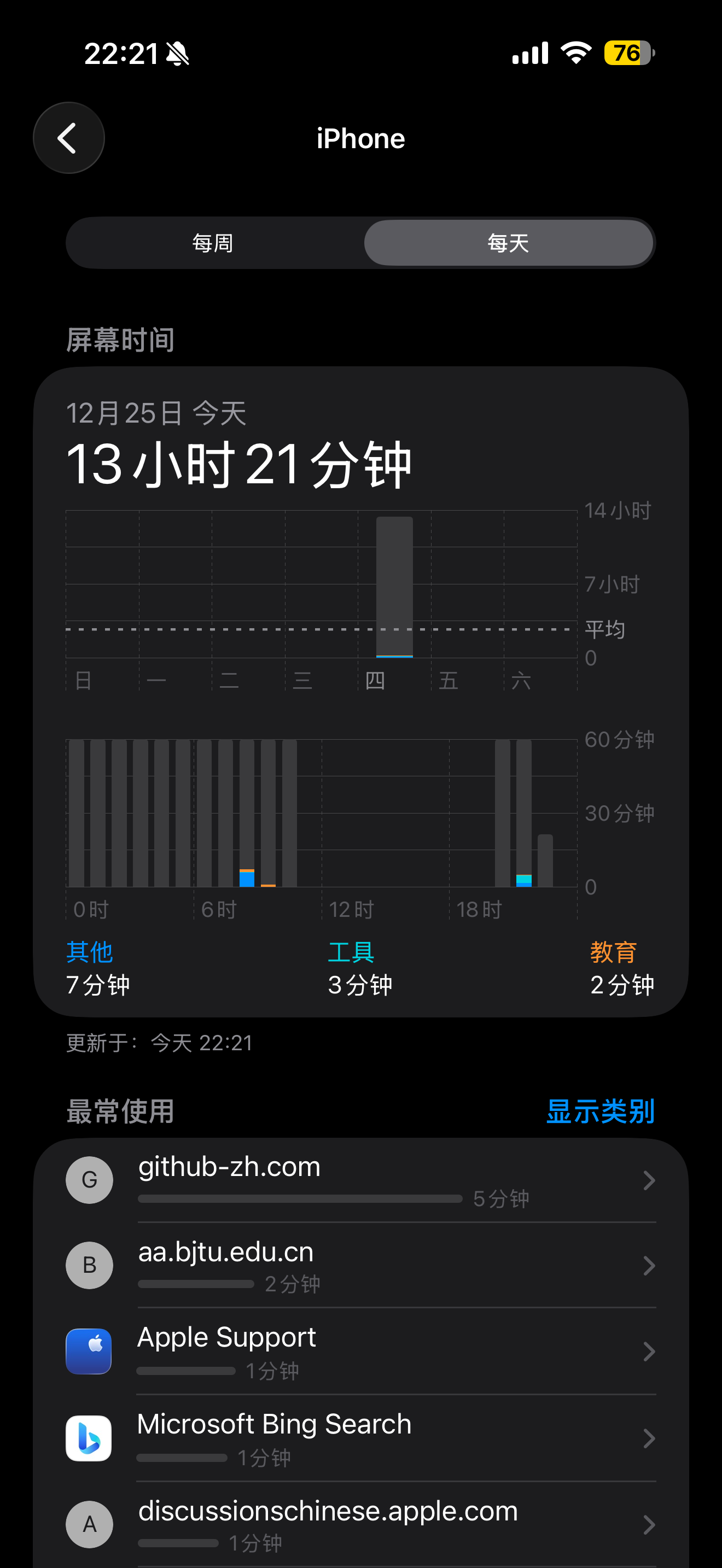 已经更新了新系统26.2 屏幕使用时间突然就不对了始终显示24个小时 而且不显示使用的app时间 只有Safari的网页信息 还原过设置但没用 关机重启后也没用