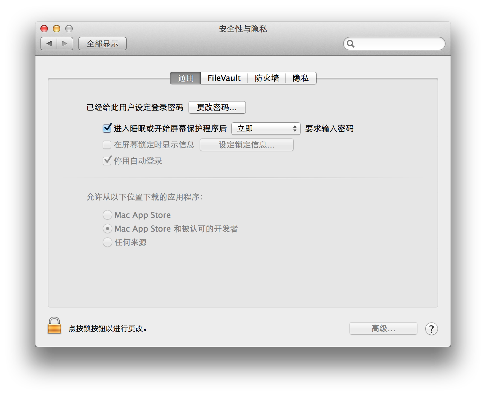 以下用户的用户个人资料: yang_曾经 yang_曾经 用户级别: 级别 6 9,327 积分 2014年3月17日 下午8:56 回应 一半、一半 检查系统偏好设置》安全》通用中是否开启睡眠或屏保输入密码的选项 回复 链接