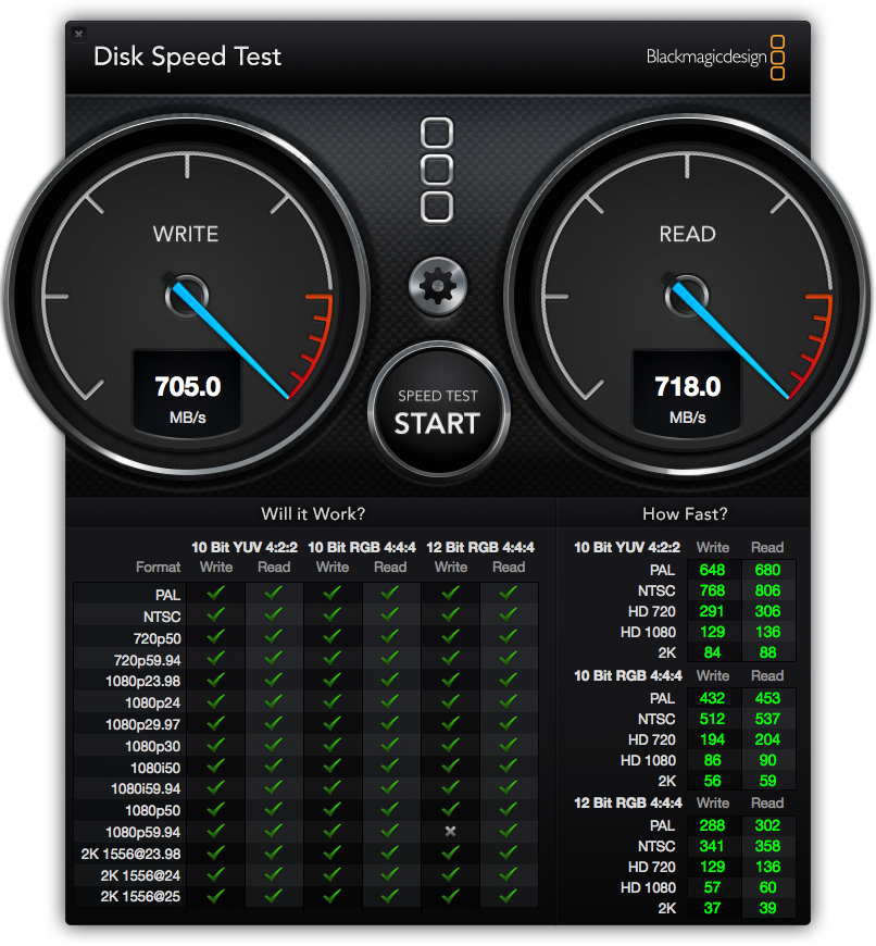 根据 Disk speed Test 5G 的测试得到的读写速度,分别是705M/s 和718M/s(如图一)。