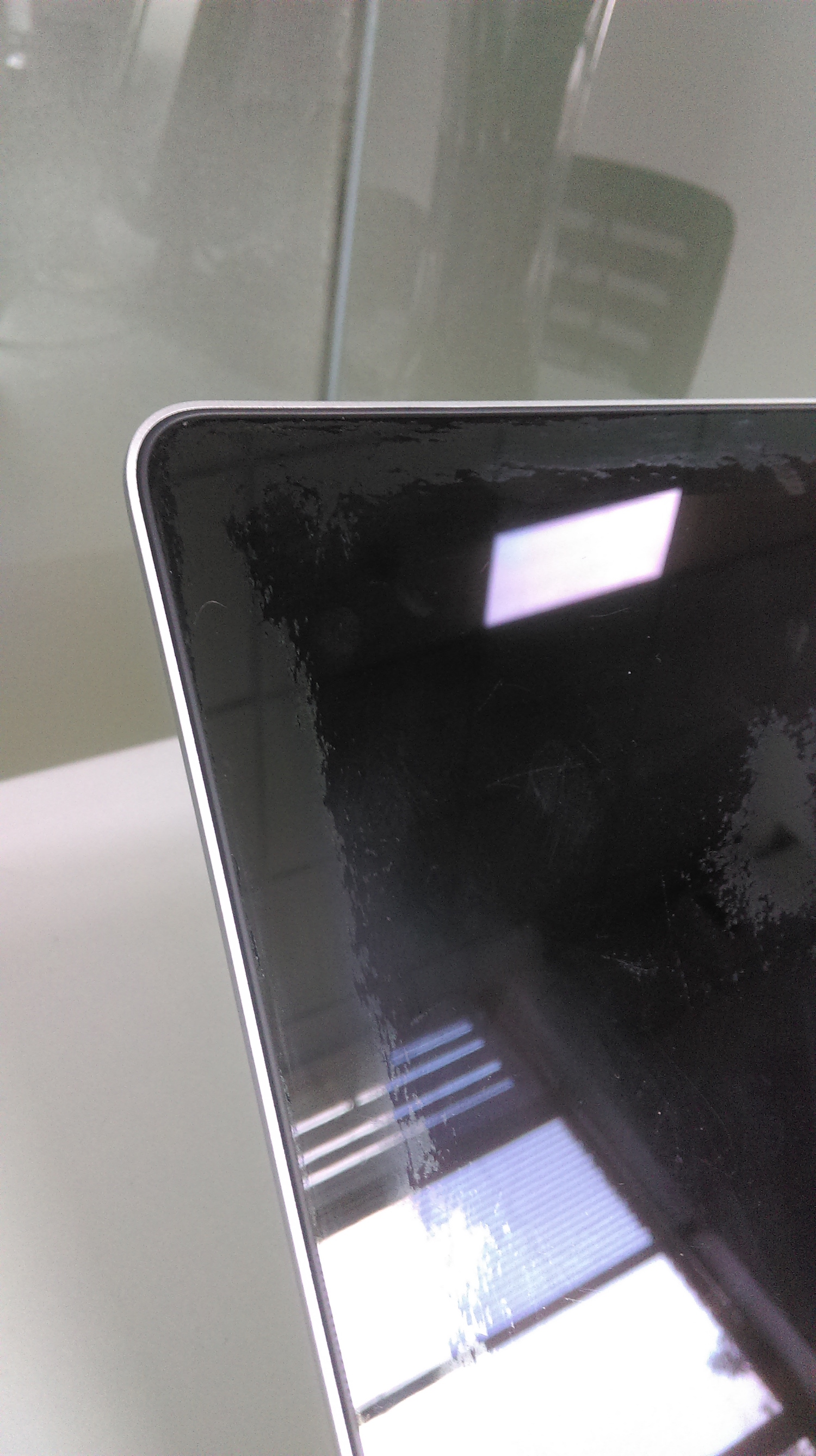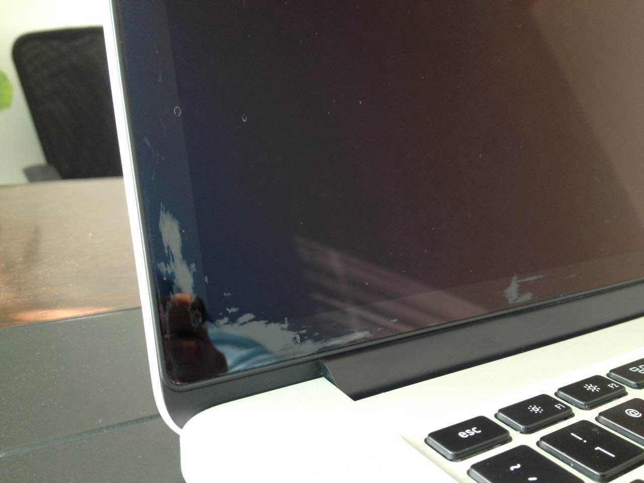 反正我的13late rmbp没有这个问题 没用水擦过 店里都是用iklear或者专用清洁剂擦屏幕 不知道你们都用什么清洁剂擦成这样😐