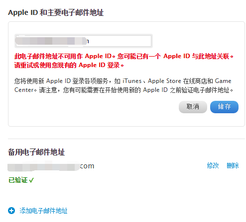 2.更改主要邮箱地址时,提示此电子邮件地址不可用作 Apple ID。您可能已有一个 Apple ID 与此地址关联。请重试或使用您现有的 Apple ID 登录。