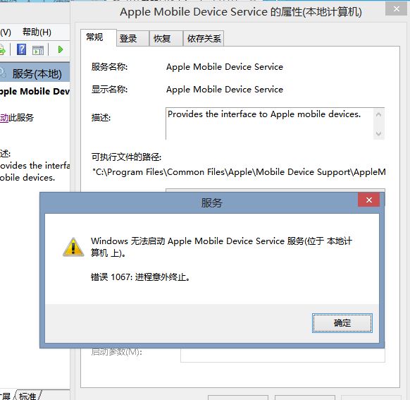 iphone6 连接Win8电脑,打开itunes,无法识别,已重新安装itunes,但打开控制面板——管理工具——服务——Apple Mobile Device Service,点击启动,便弹出错误提示:1067,望大神能给出解决方案!