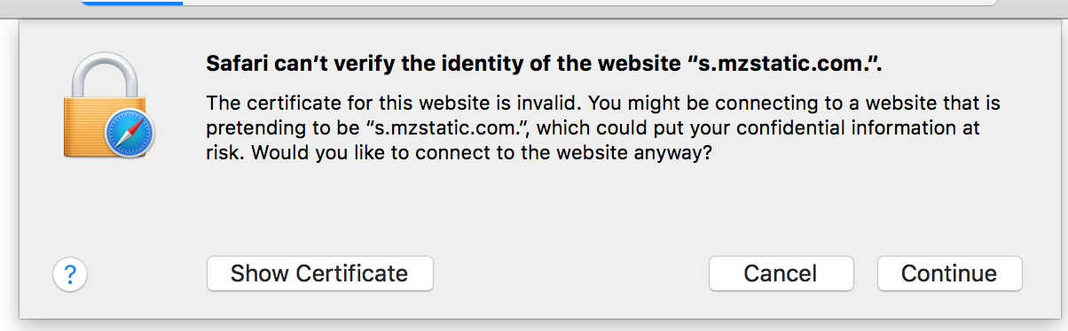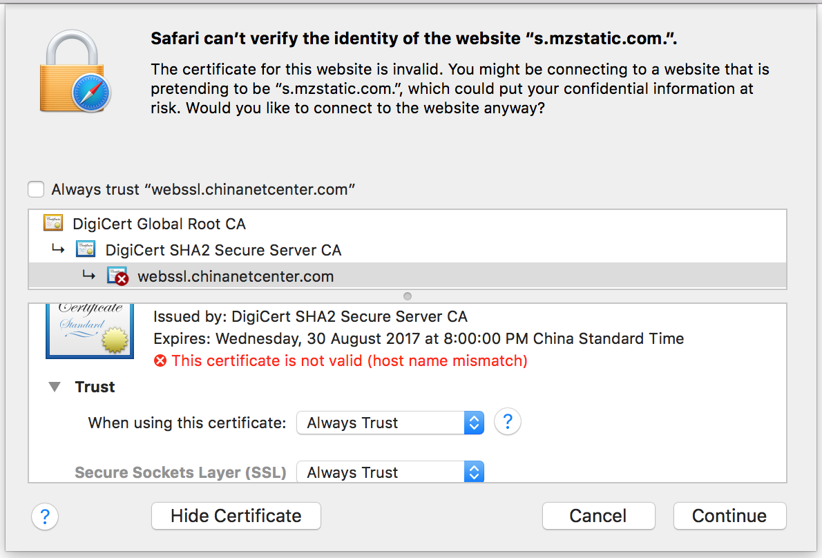 在Safari中输入“https://s.mzstatic.com."并访问(注意不要遗漏com后面的"."),这个时候会提示该服务器的证书无效,这个时候只要把“使用此证书时”设置为“始终信任”就解决了!