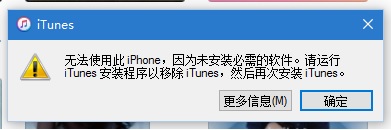 于是在插入iphone后,itunes提示“无法使用该iphone”,根本没有出现iphone的管理界面,但手机上有提示是否信任改电脑。itunes上的提示如下